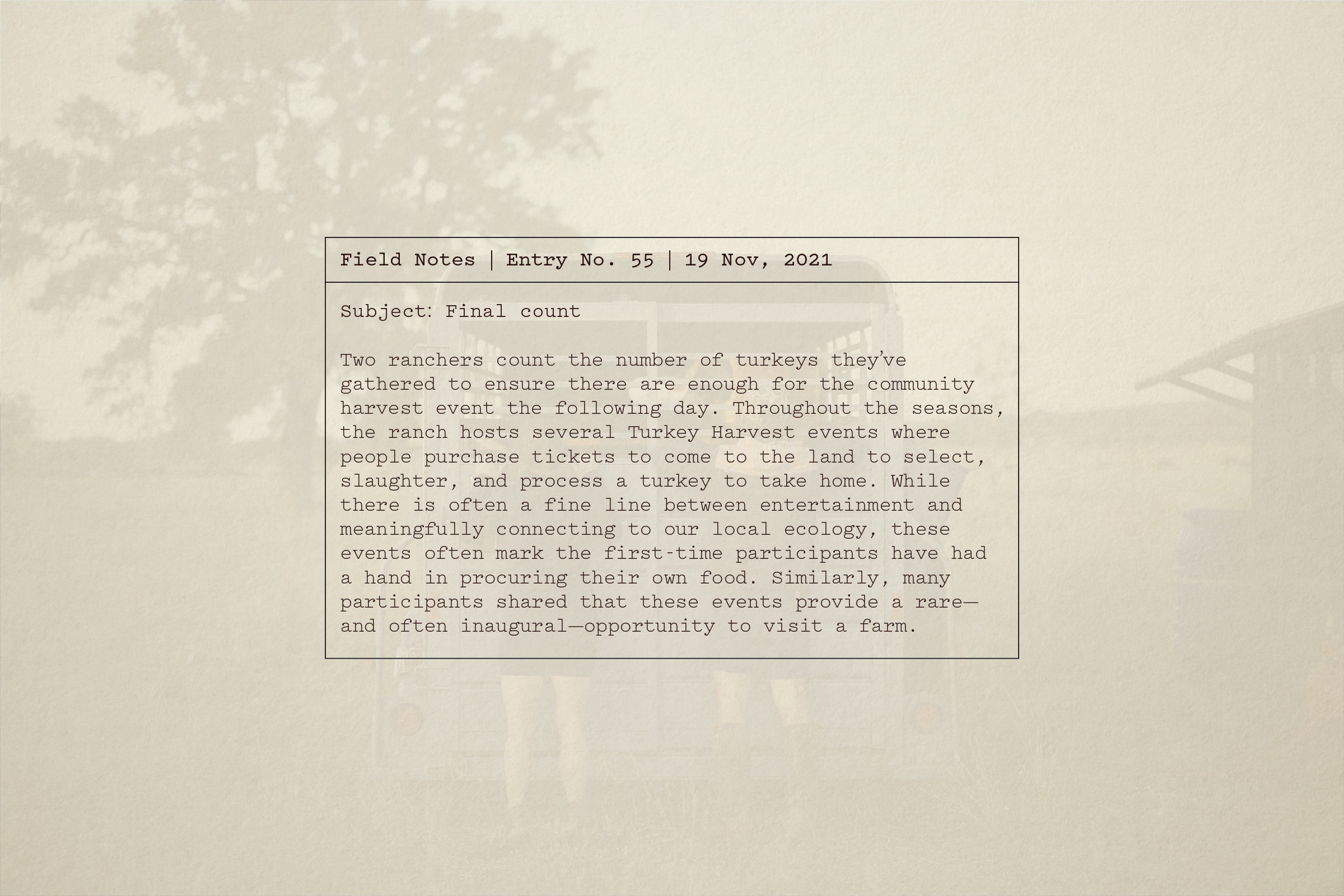 Many thanks to Katie Forrest and Taylor Collins for making this work possible—especially regarding your enthusiasm, openness, and hospitality. Thank you as well to Margaux Crump and James Tomeny for your astounding turkey herding abilities. I’m also grateful to Cindee Klement for bringing me to the ranch many, many moons ago. Finally, thank you to all the turkeys for accepting me into the flock, offering a glimpse into your world, and sharing such a profound experience. ✨🦃✨