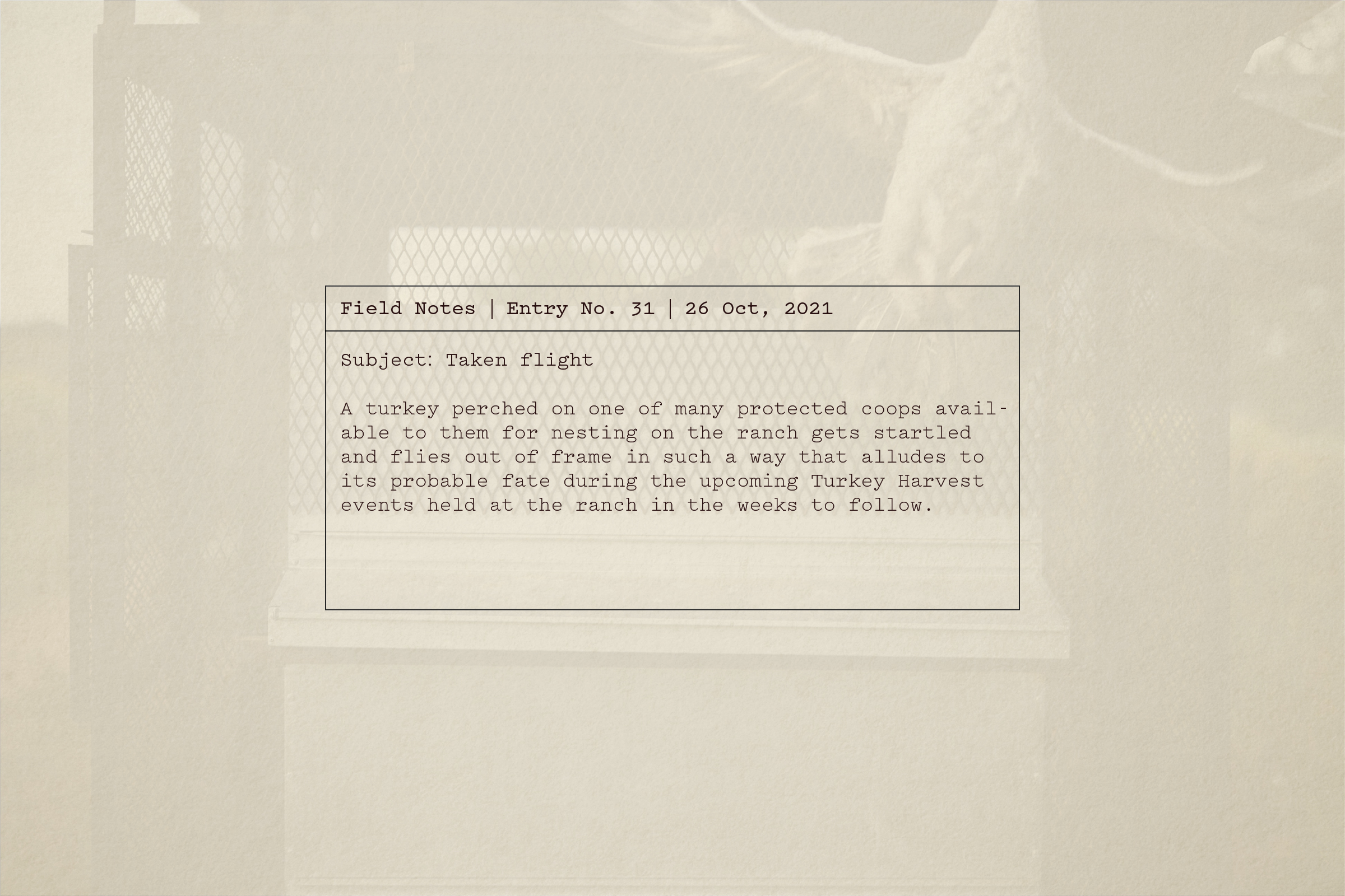 2022 Hill Country, Texas, United StatesMade over the course of a year, this body of work follows the everyday life—and ultimate slaughter—of free range, heritage breed turkeys living on a regenerative ranch in the heart of the Texas Hill Country.